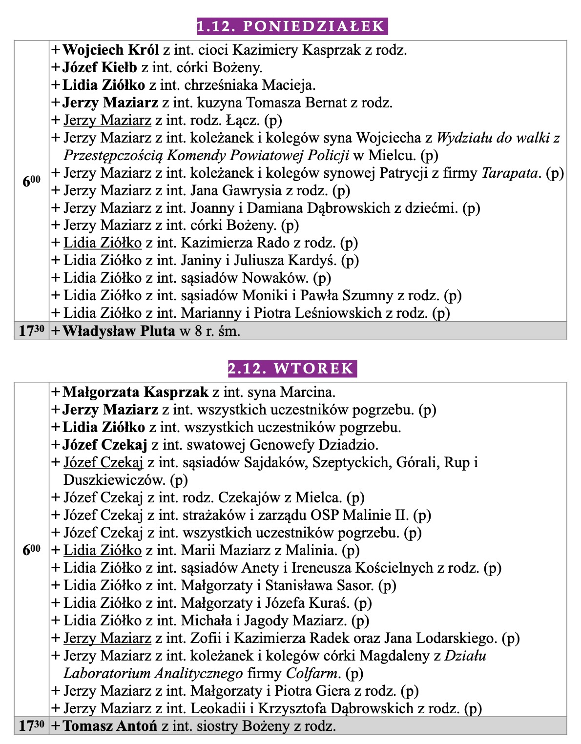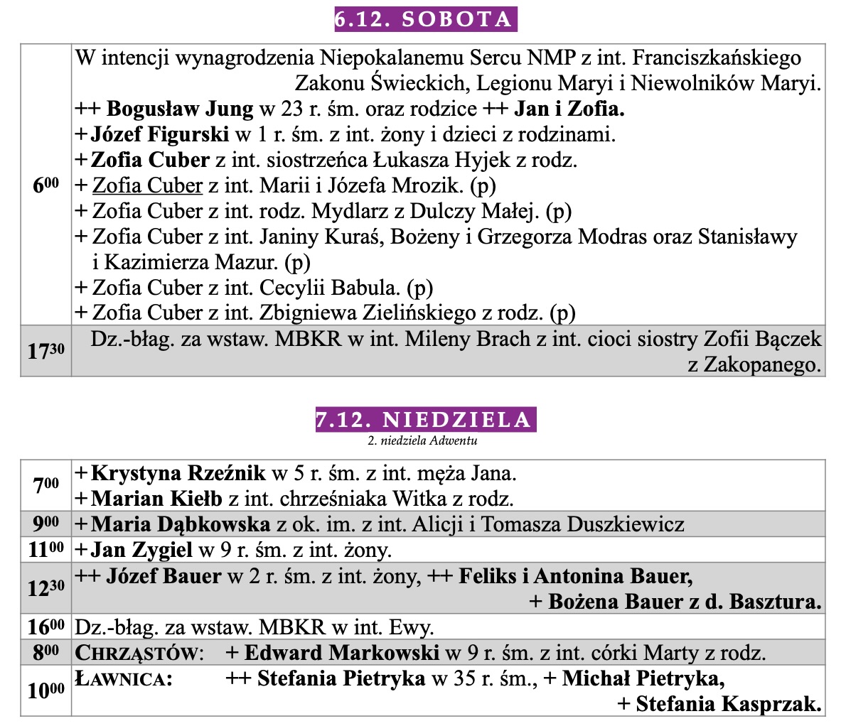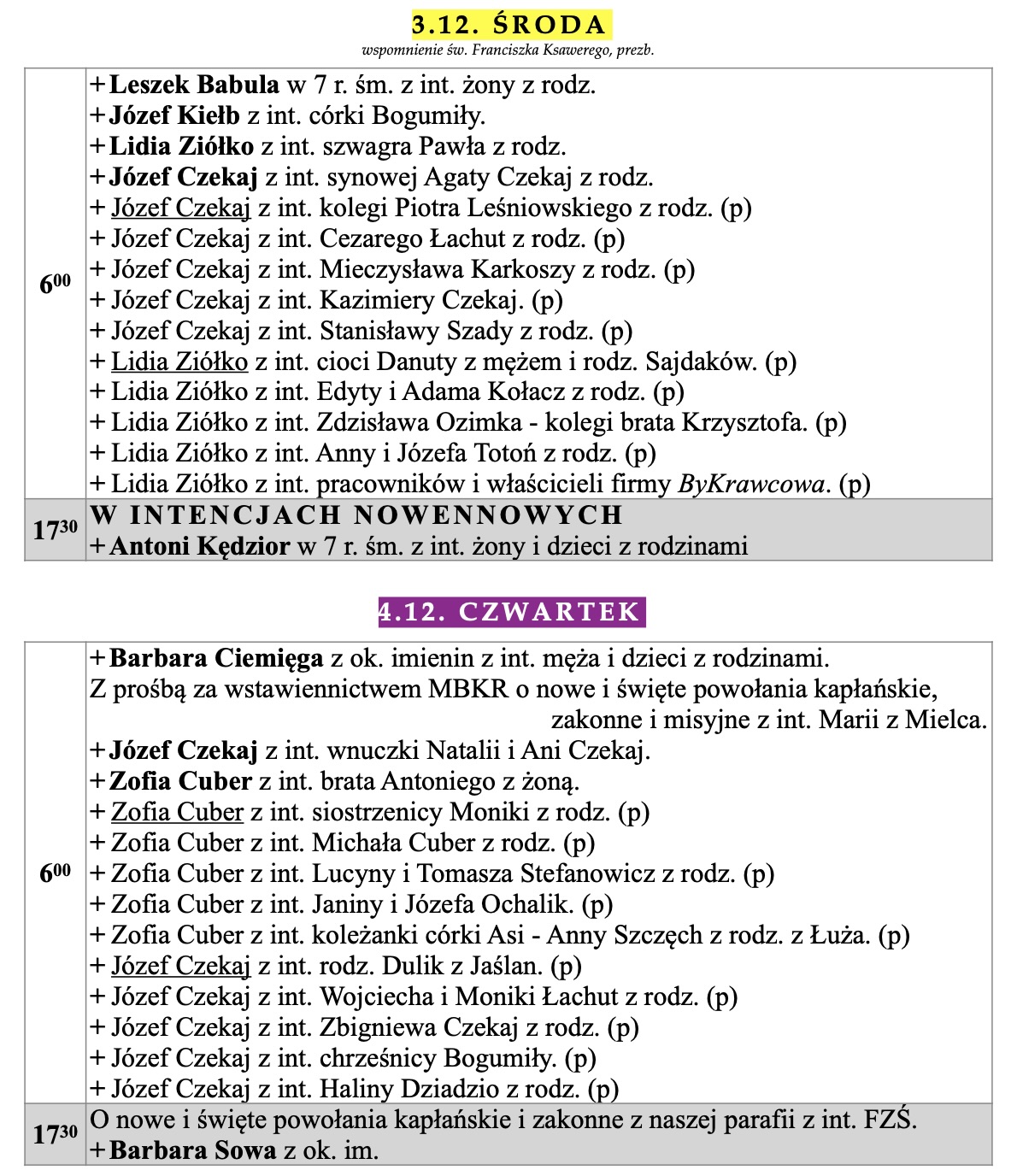 Intencje mszalne 1 niedziela Adwentu, 30.11.2025