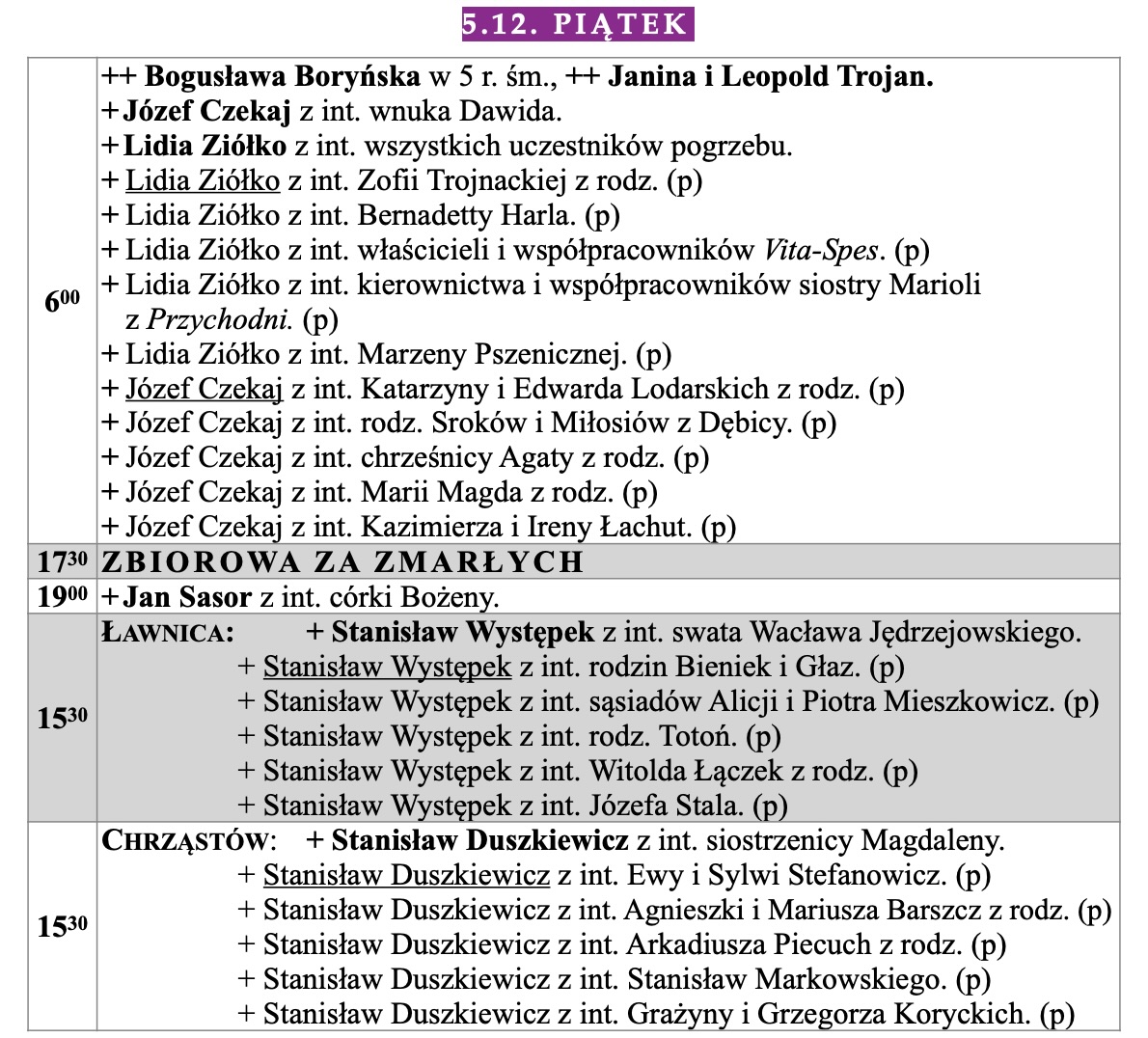 Intencje mszalne 34 tydzień zwykły, 23.11.2025