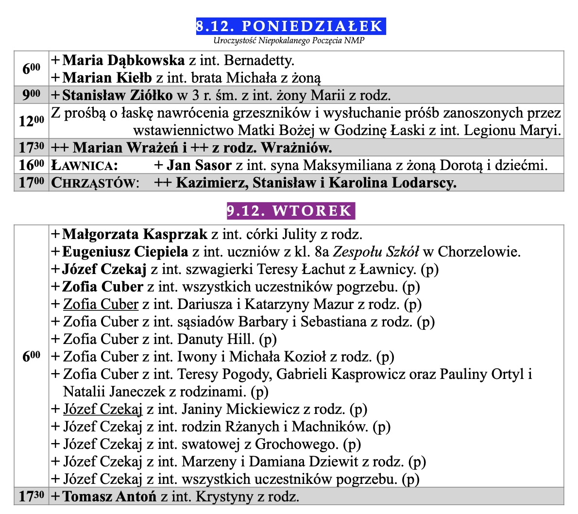 Intencje mszalne 2 niedziela Adwentu, 07.12.2025
