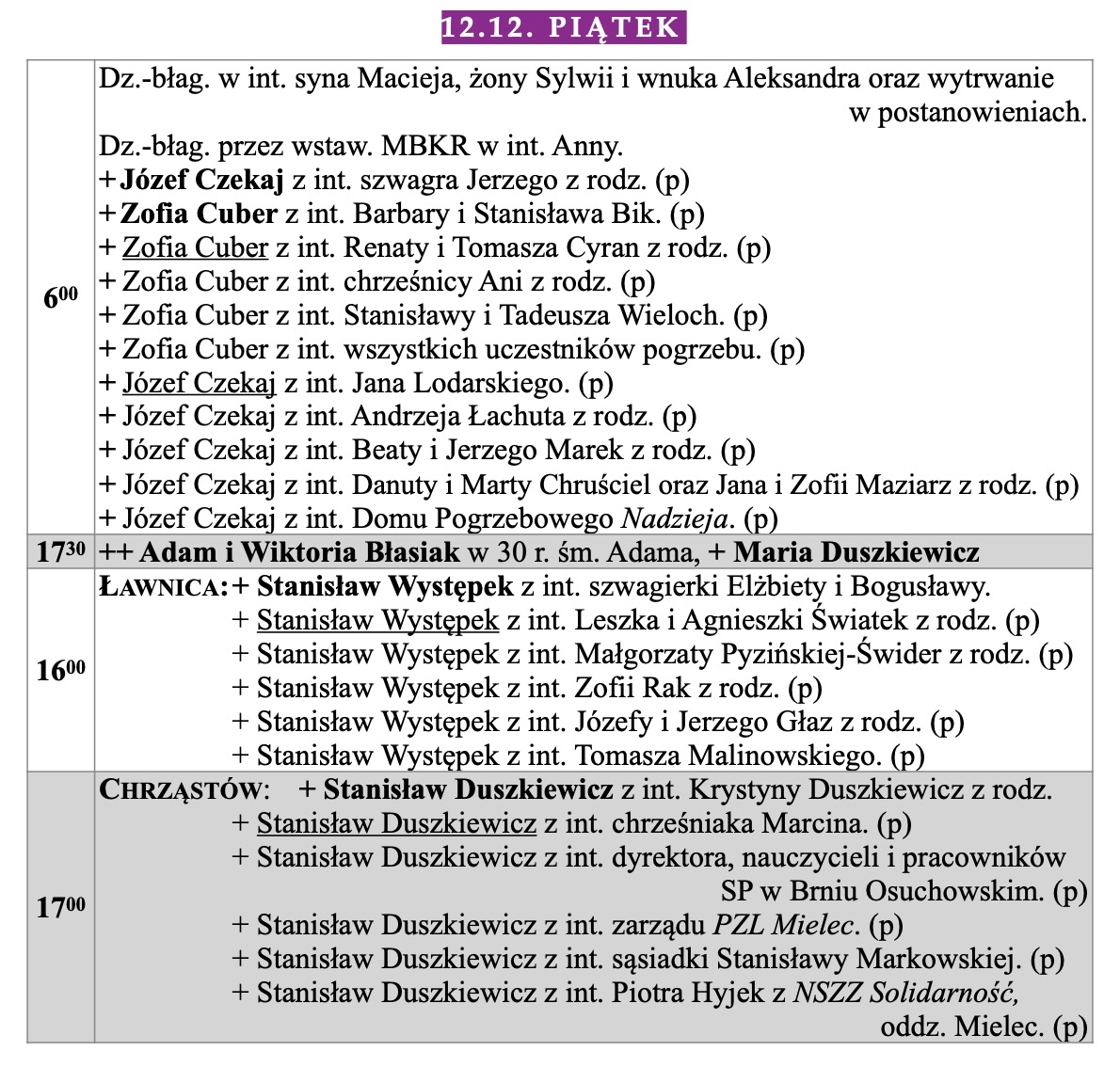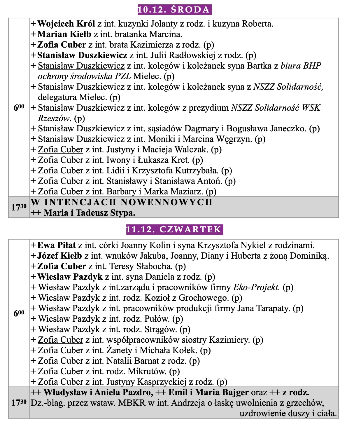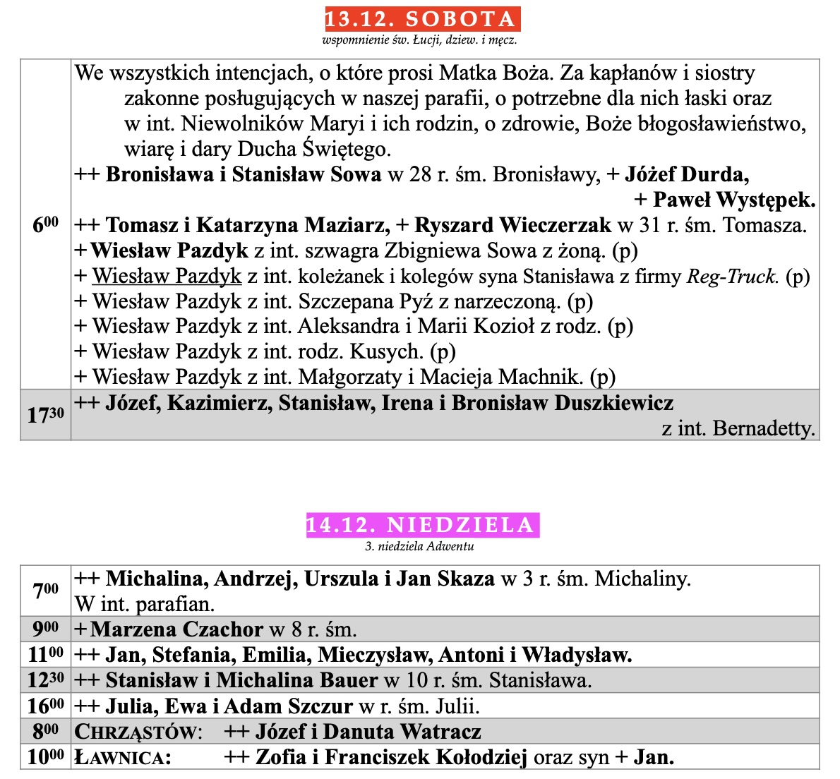 Intencje mszalne 3 niedziela Adwentu, 14.12.2025