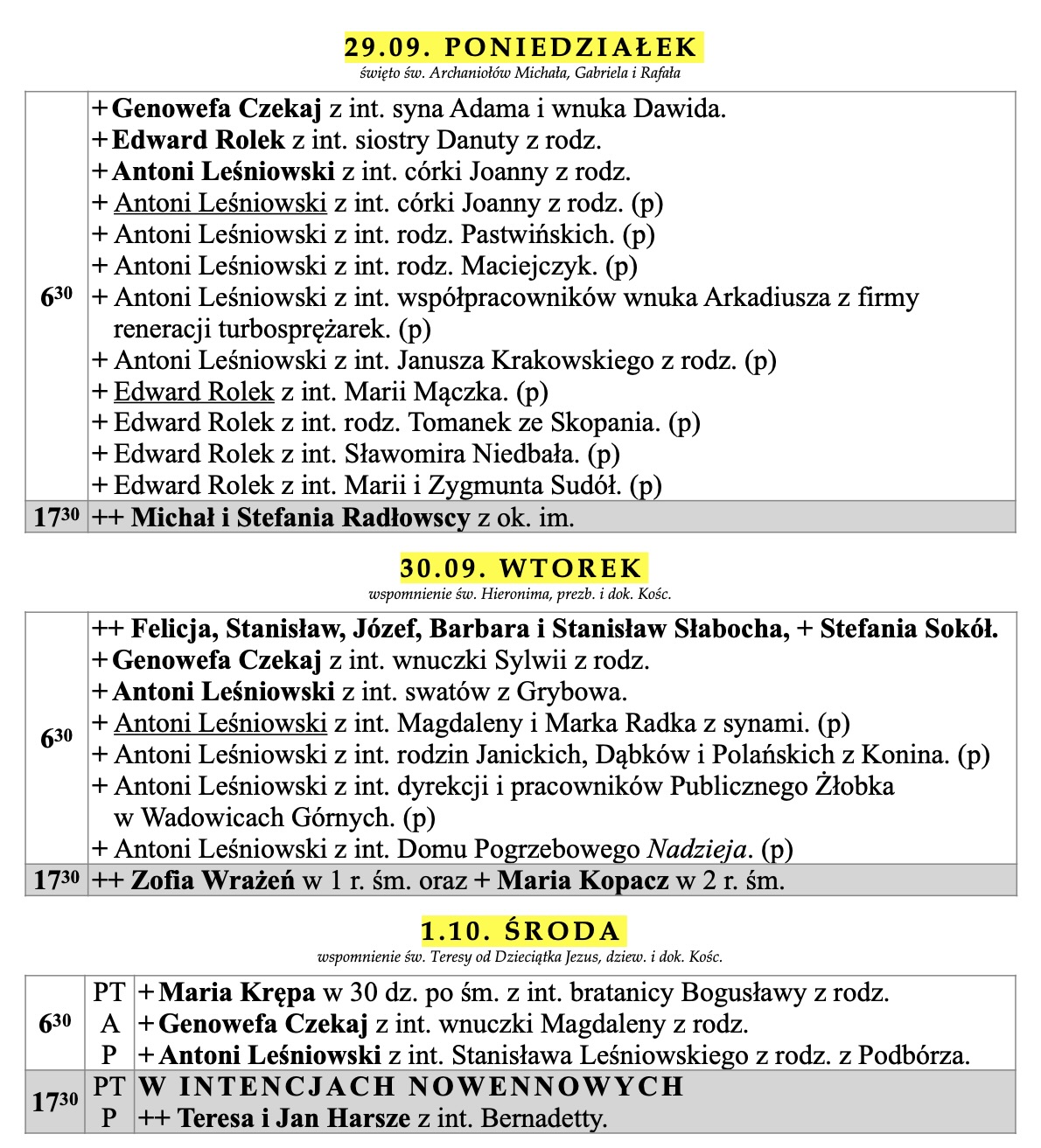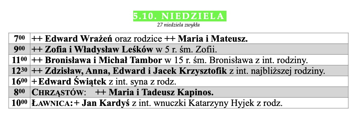 Intencje mszalne 26 tydzień zwykły, 28.09.2025