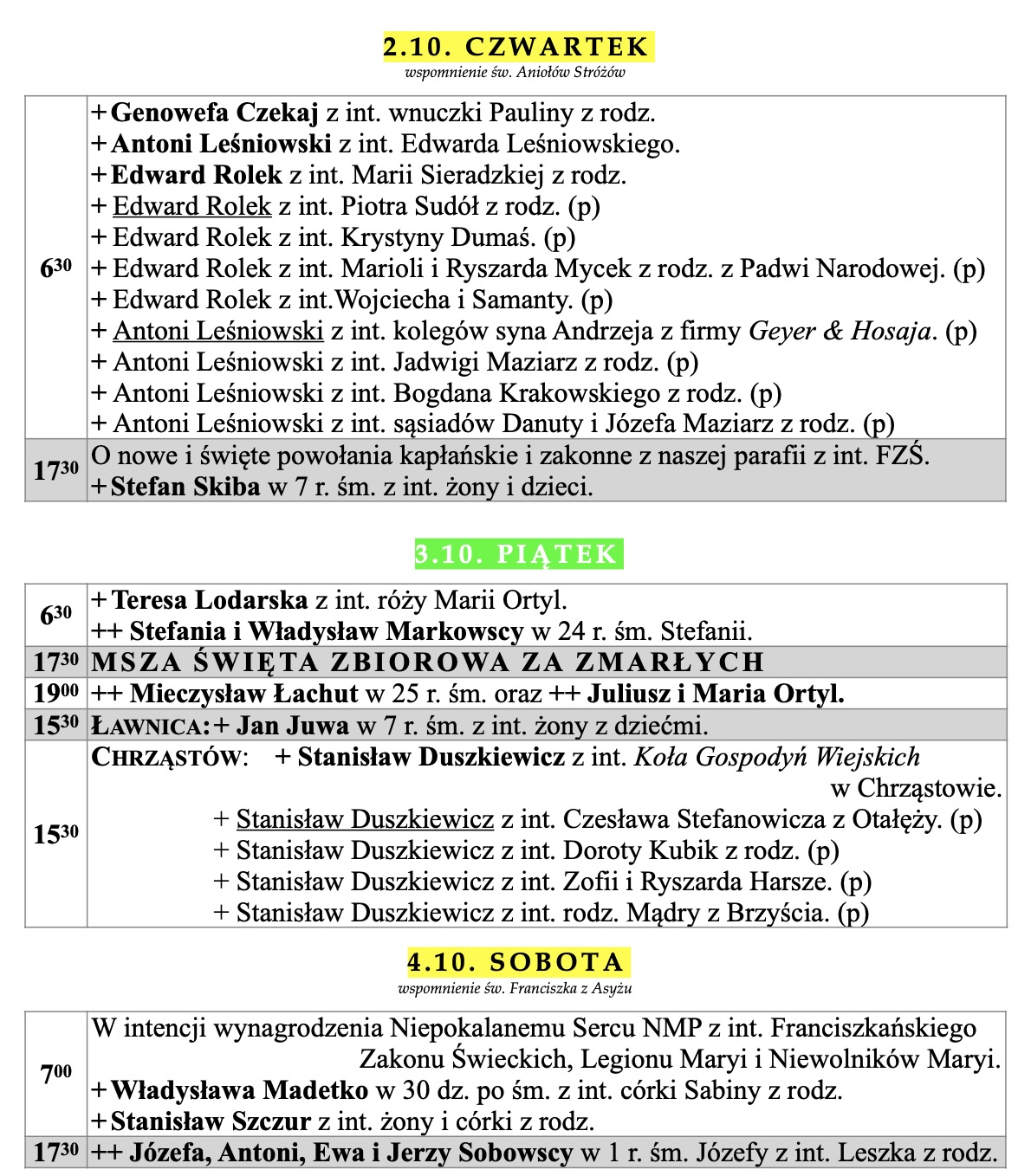 CODZIENNIE Z WYJĄTKIEM ŚWIĄT I PIERWSZYCH PIĄTKÓW MIESIĄCA