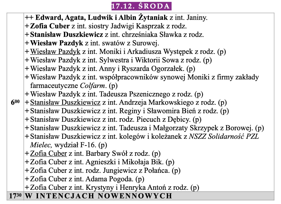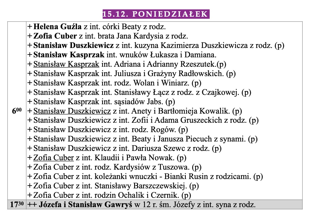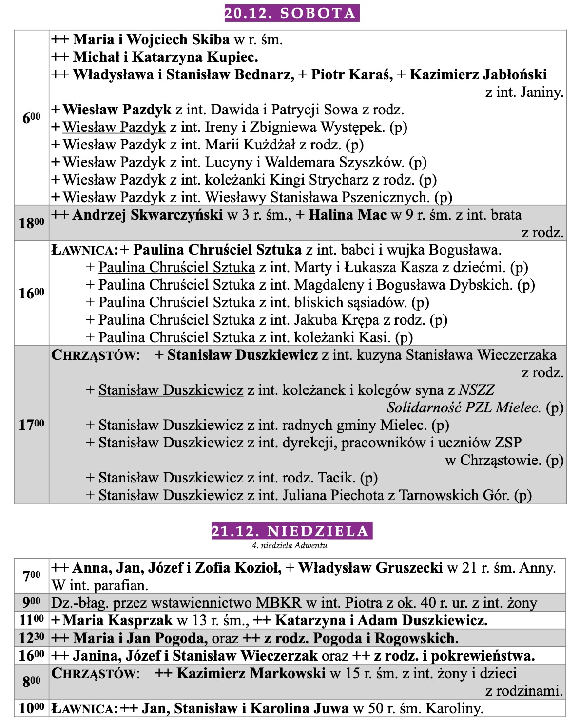 Intencje mszalne 3 niedziela Adwentu, 14.12.2025