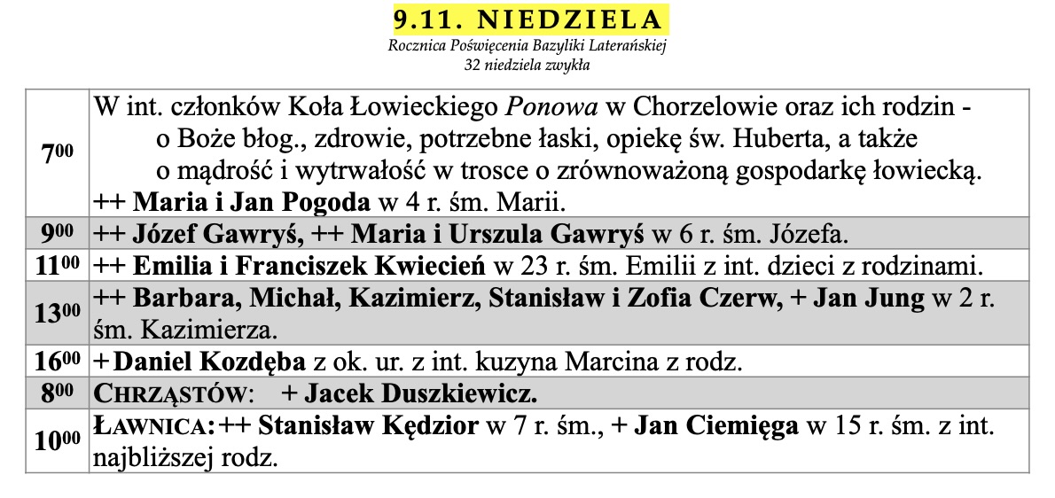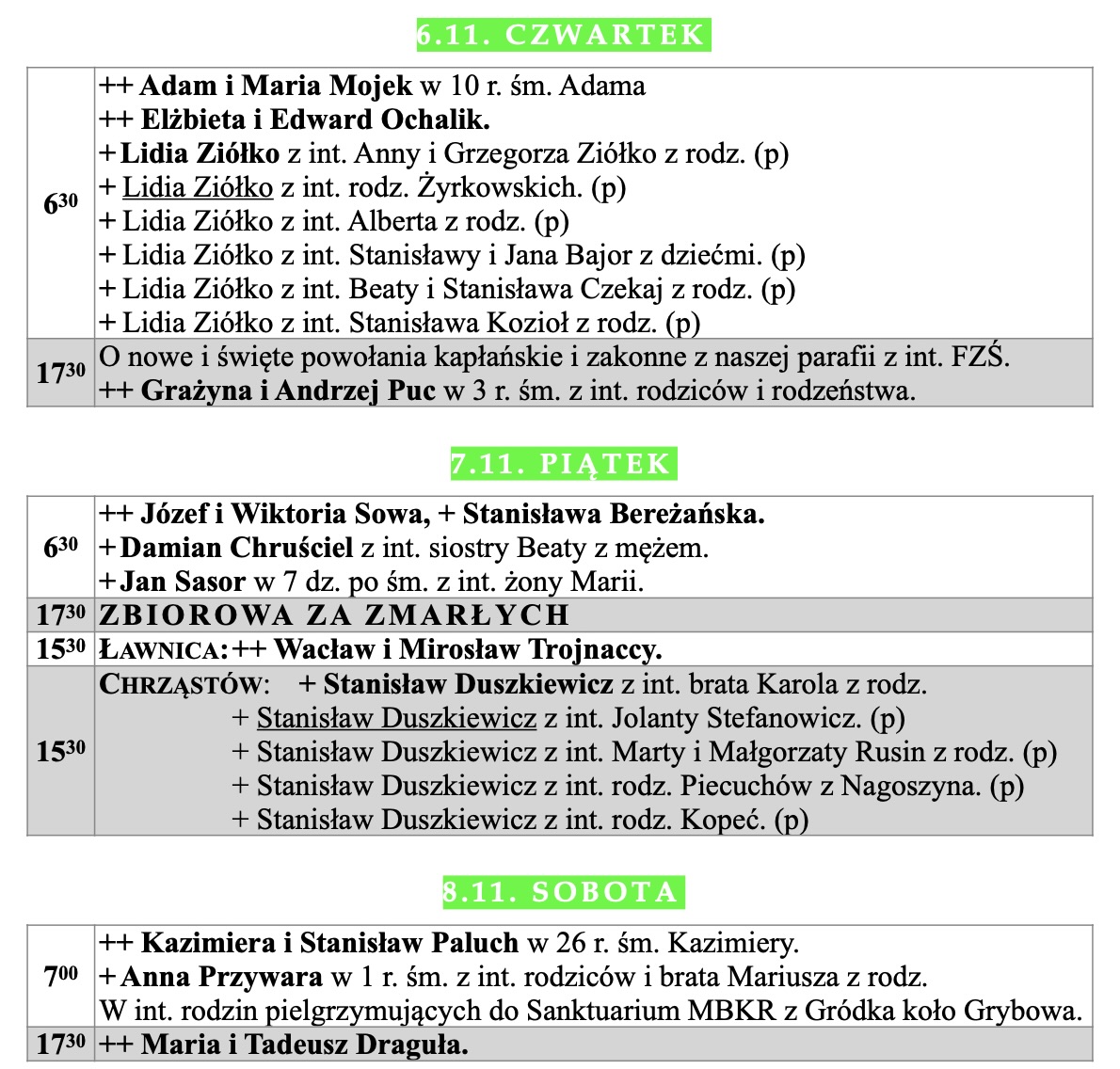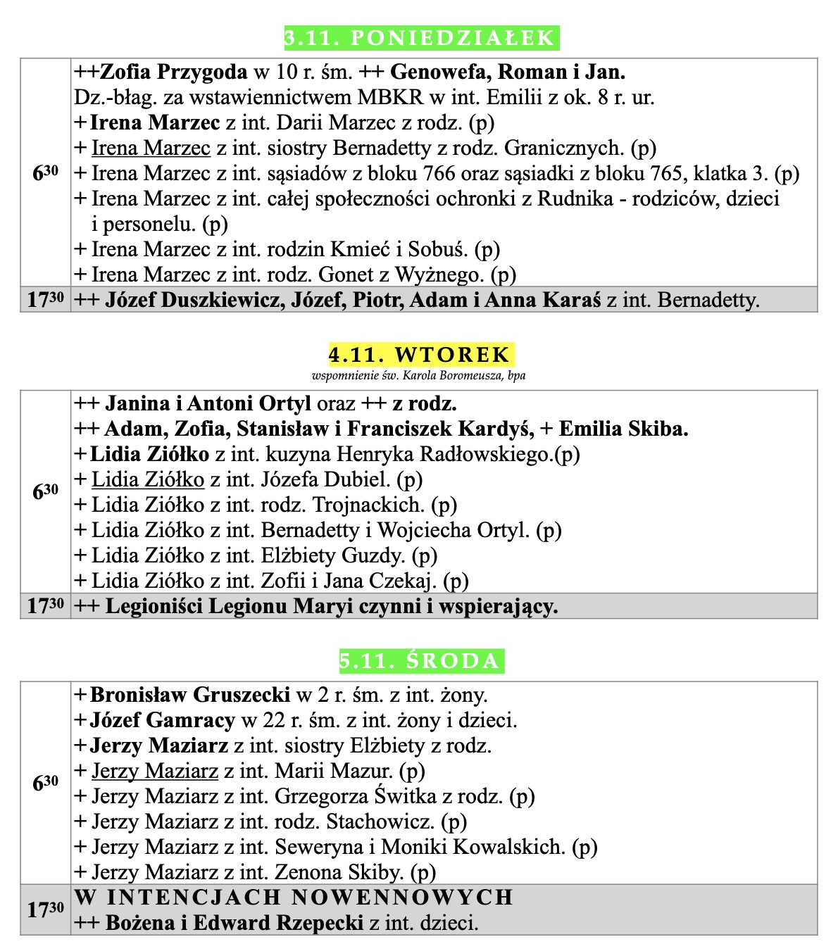 Intencje mszalne 31 tydzień zwykły, 2.11.2025