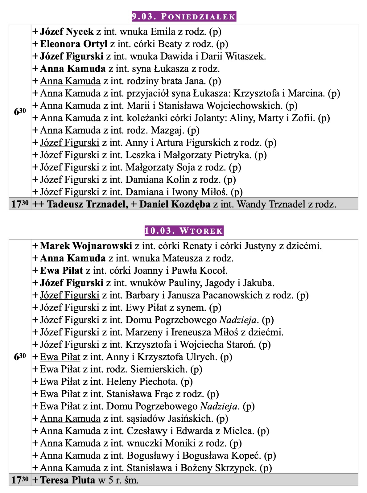 Intencje mszalne, III niedziela WP, 8.03.2026