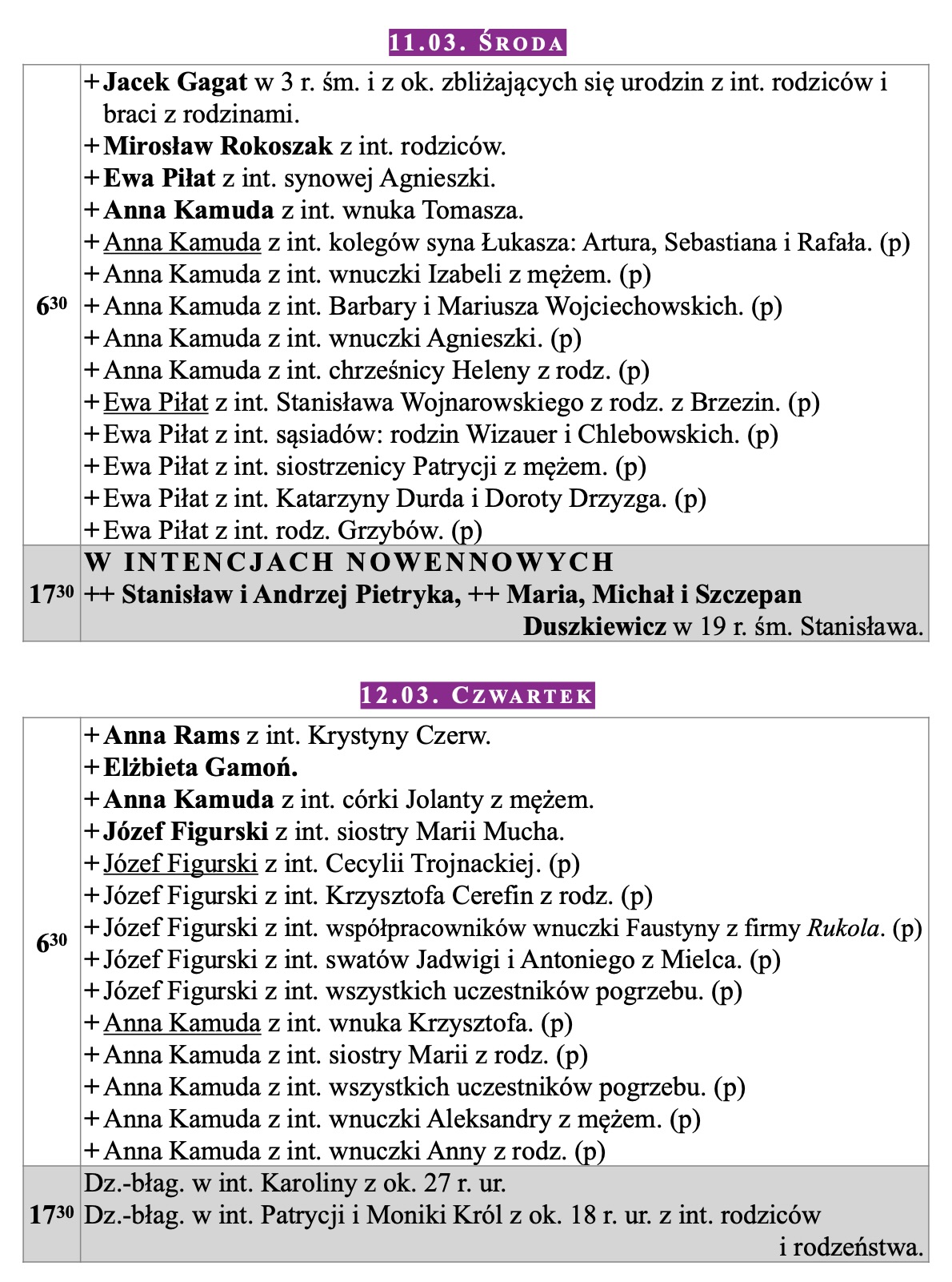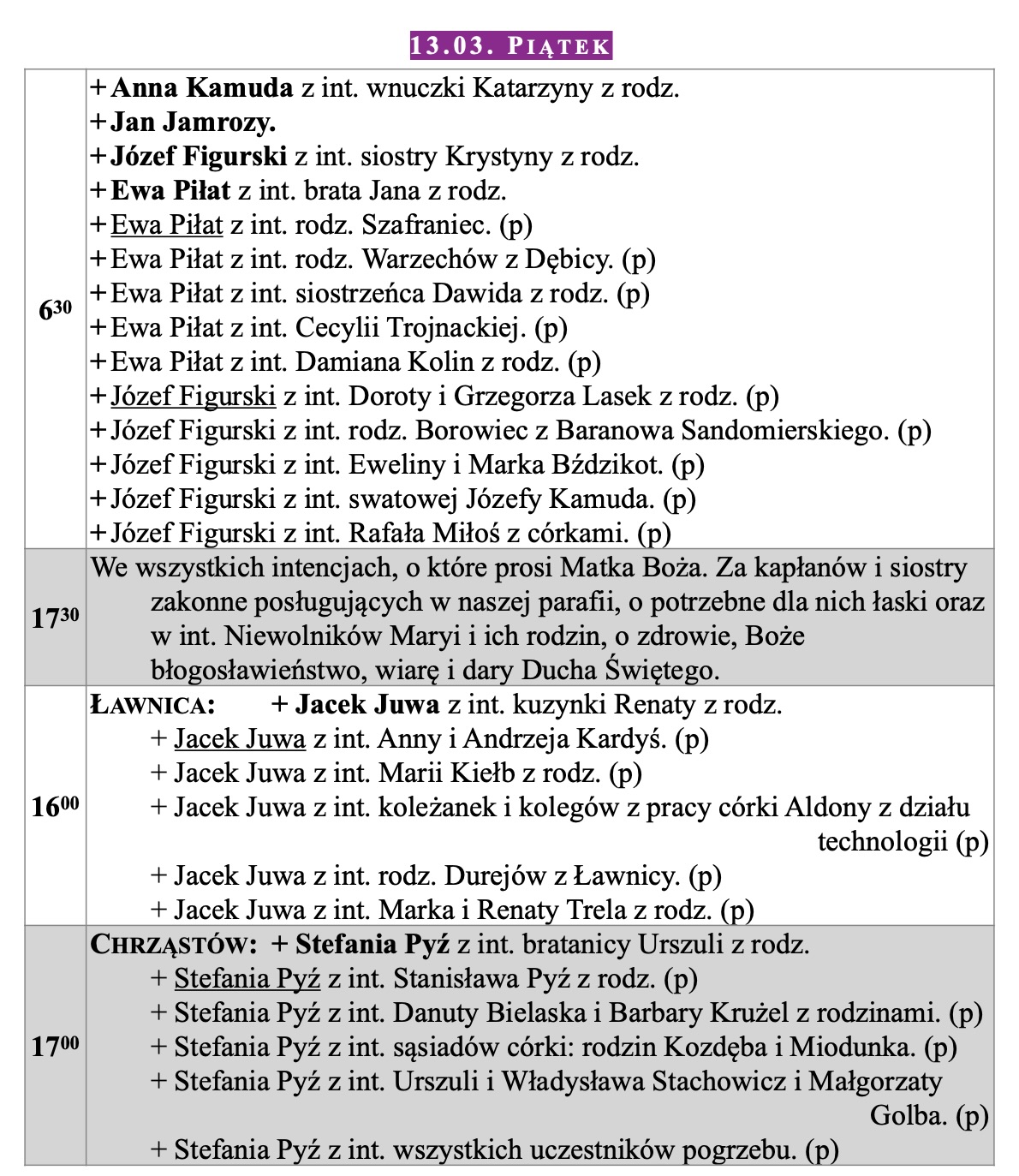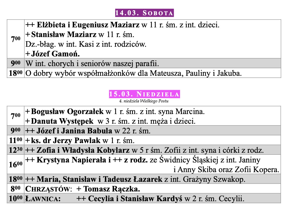 Intencje mszalne, IV niedziela WP, 15.03.2026