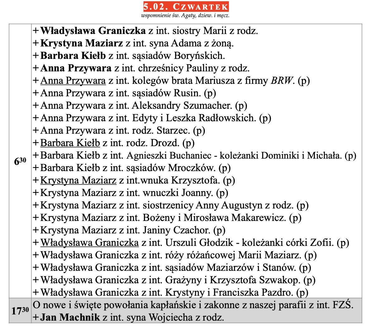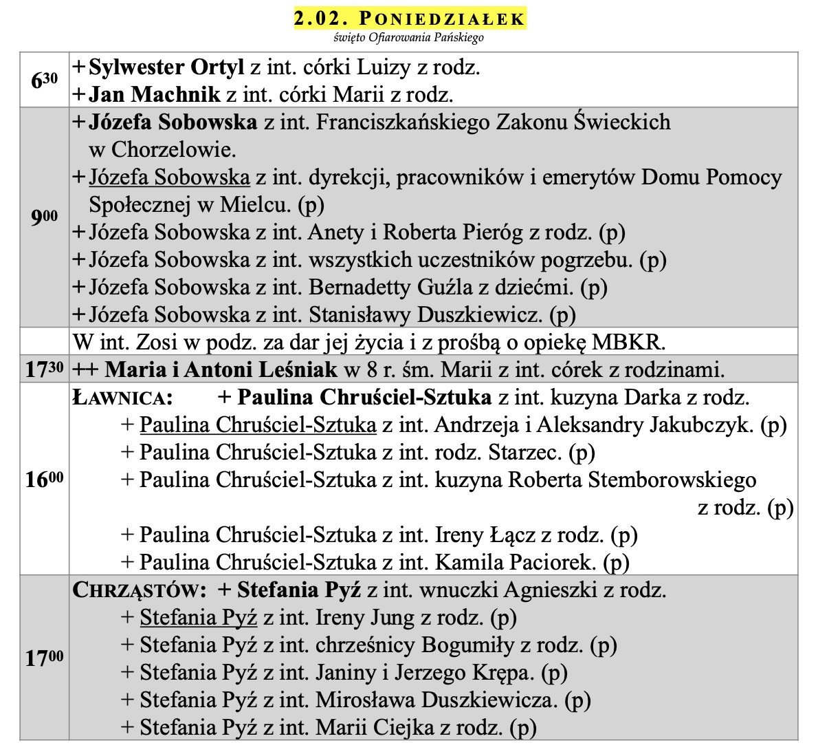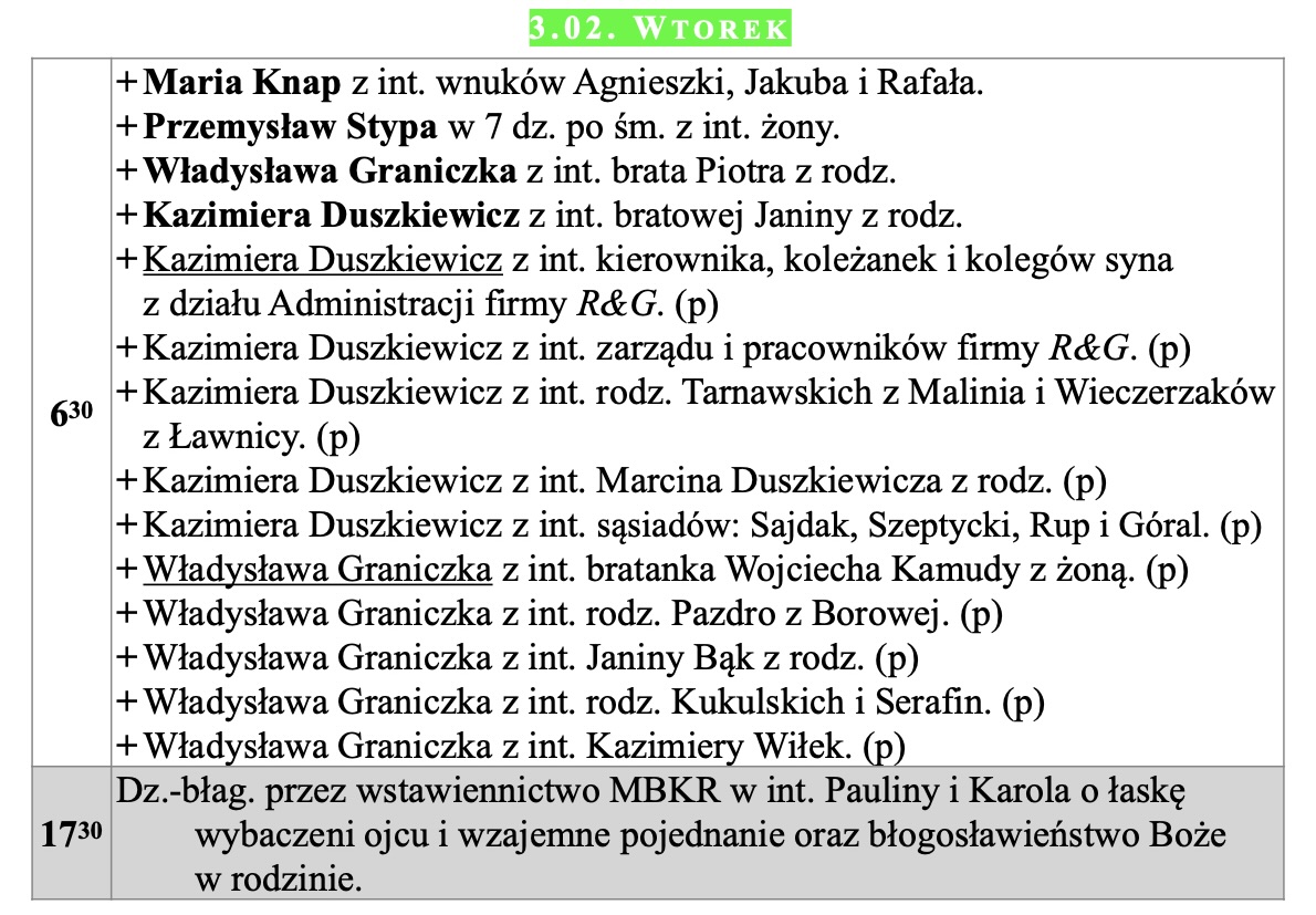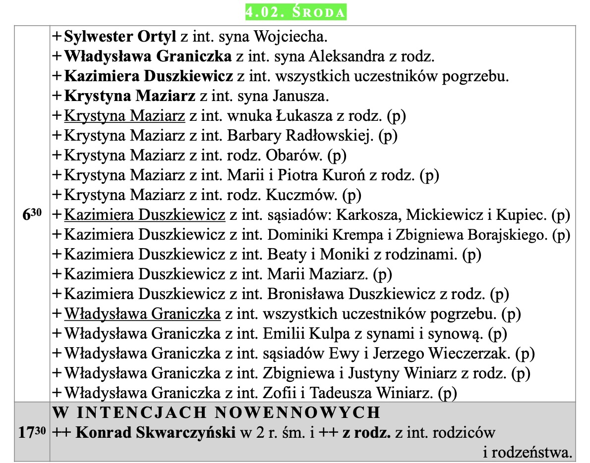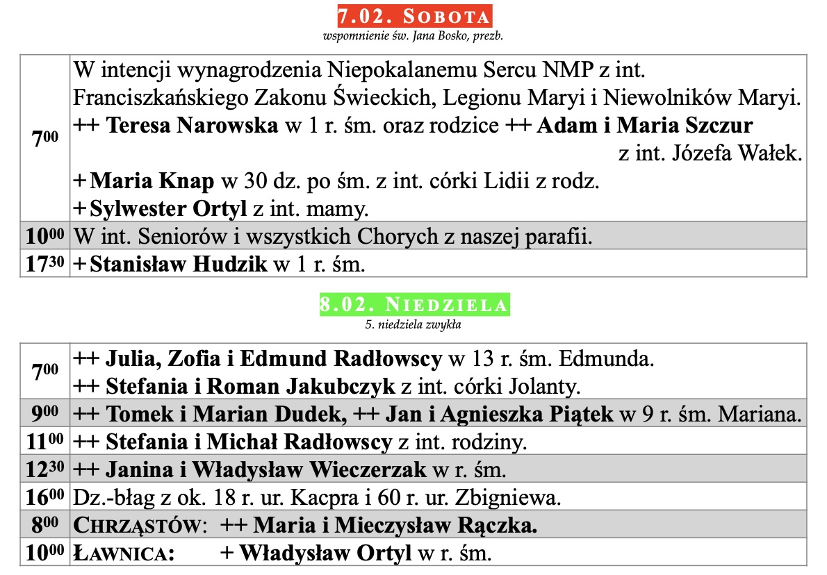 Intencje mszalne, IV niedziela zwykła, 1.02.2026