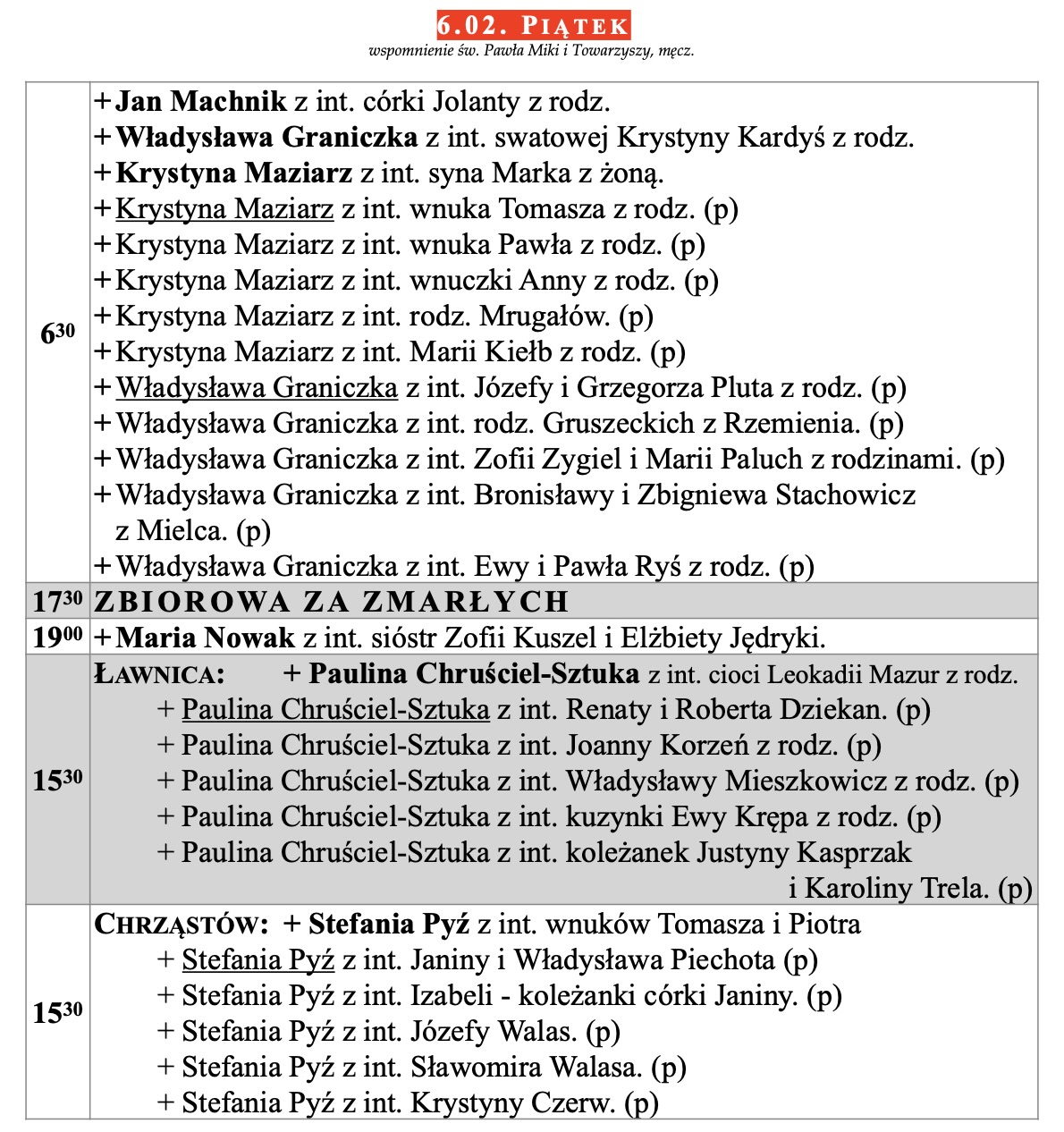 CODZIENNIE Z WYJĄTKIEM ŚWIĄT I PIERWSZYCH PIĄTKÓW MIESIĄCA