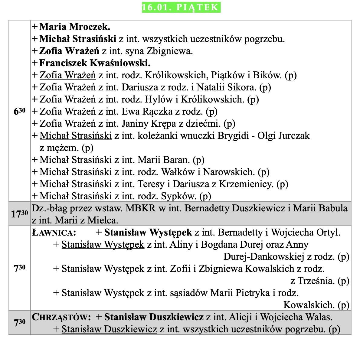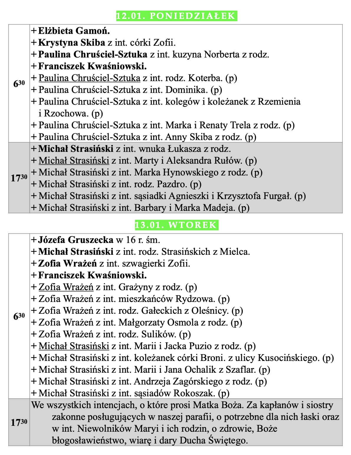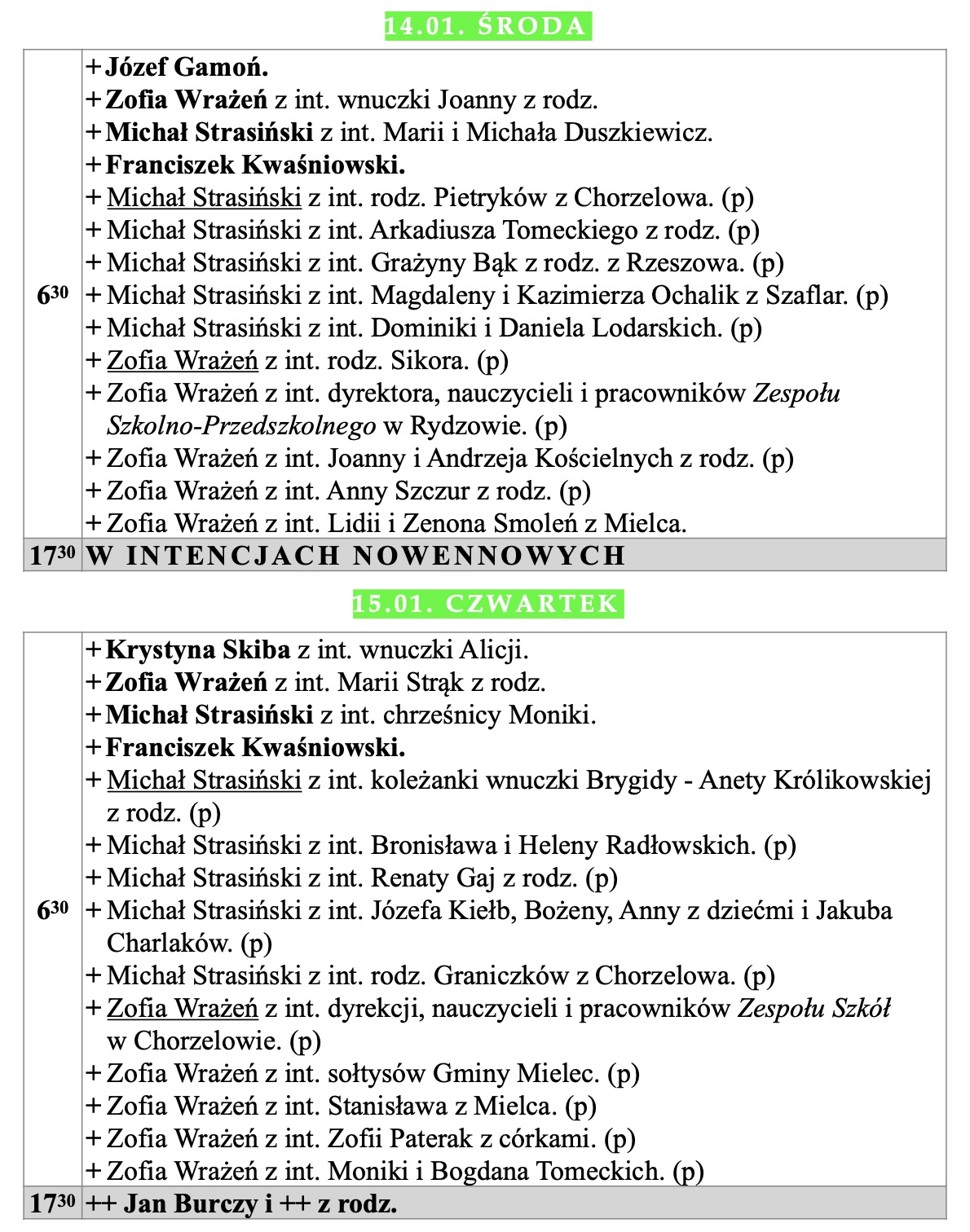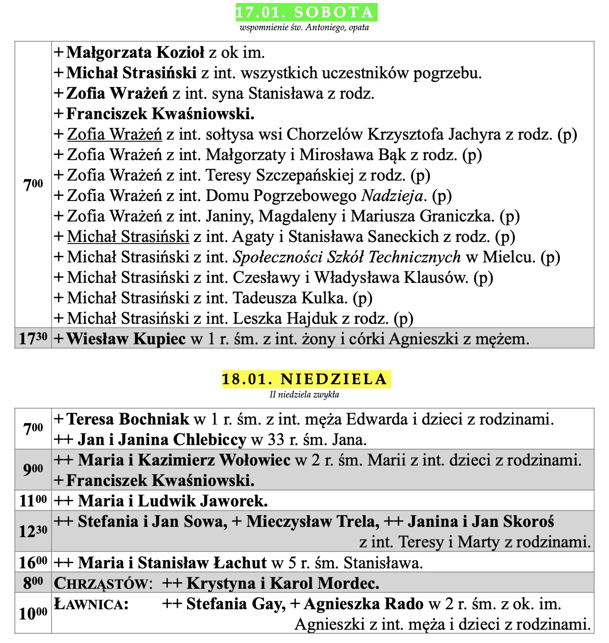 Intencje mszalne, IV niedziela zwykła, 1.02.2026