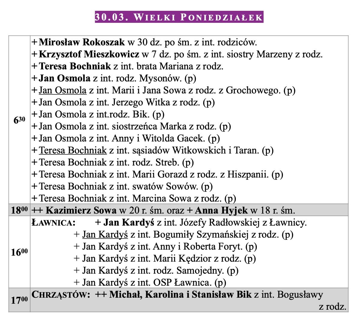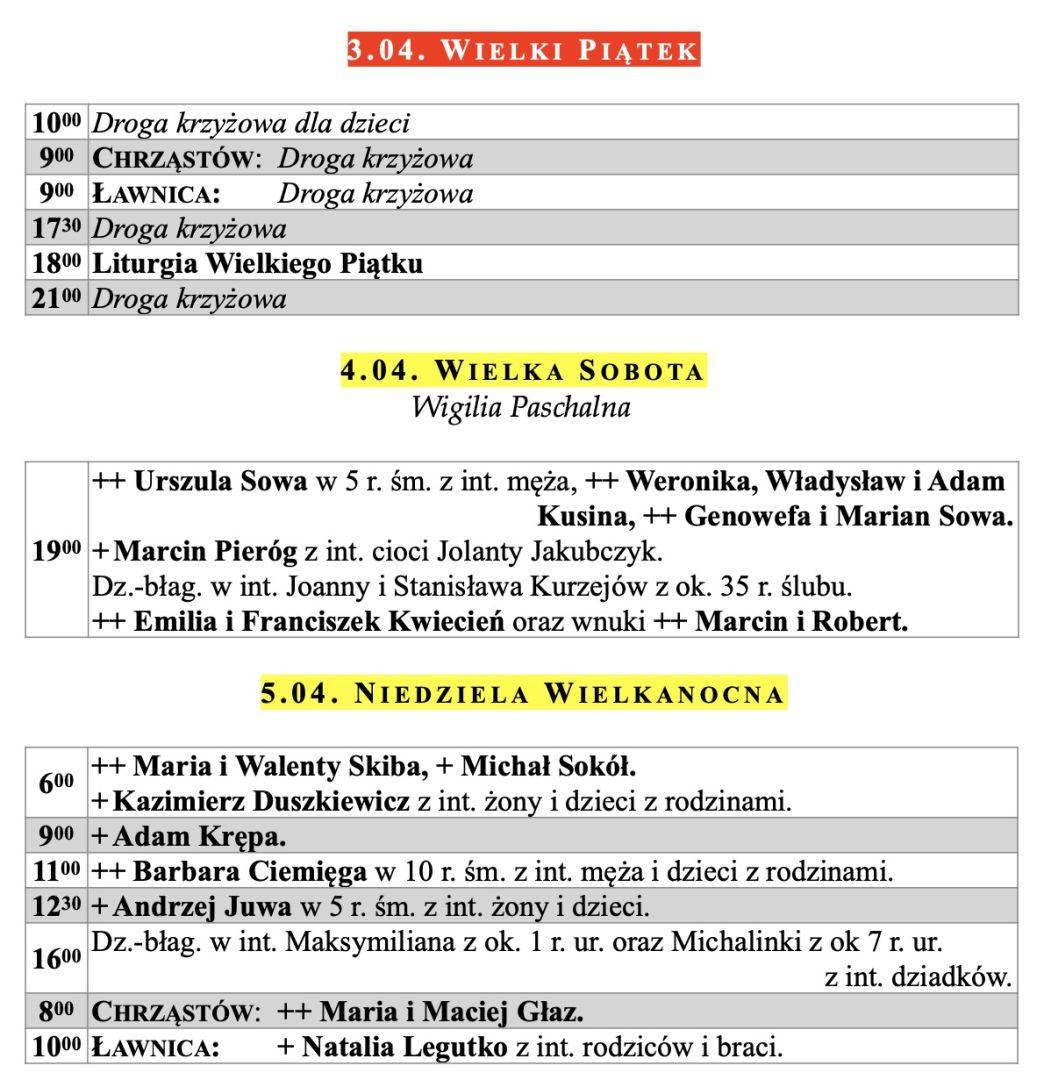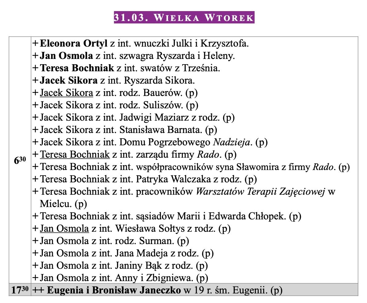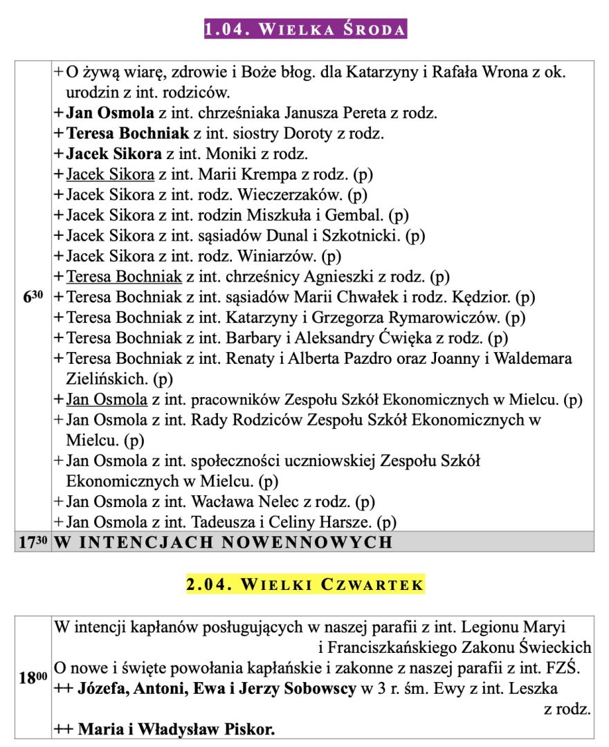 Intencje mszalne, Niedziela Palmowa, 29.03.2026