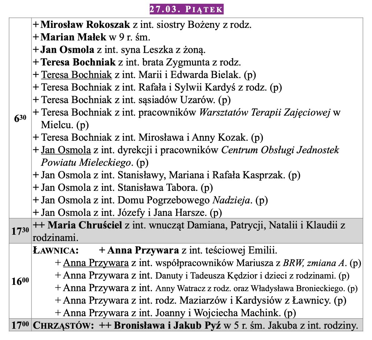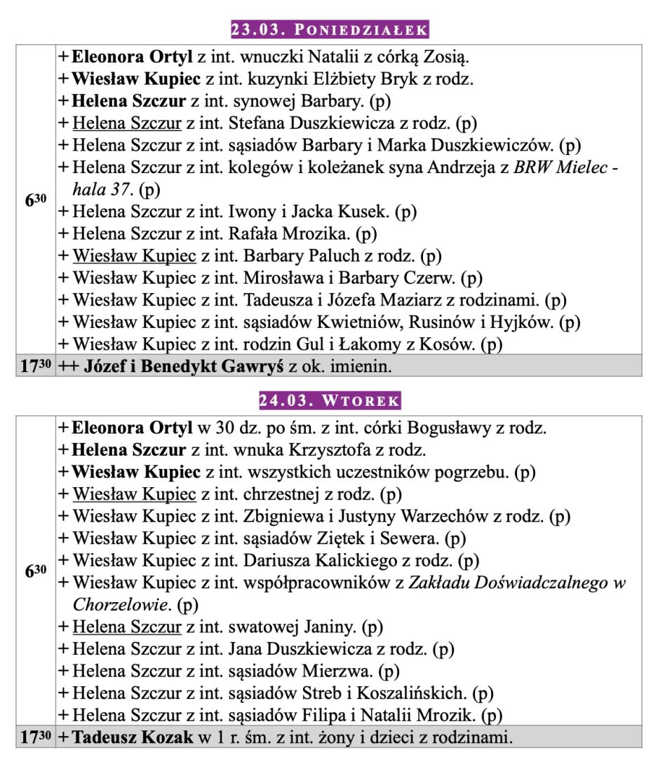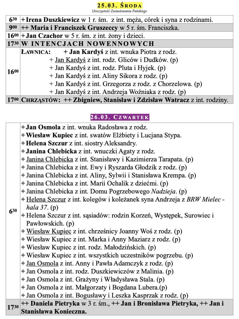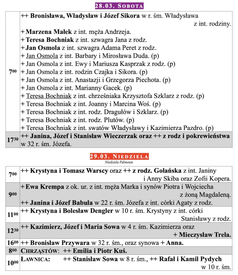 Intencje mszalne, Niedziela Palmowa, 29.03.2026