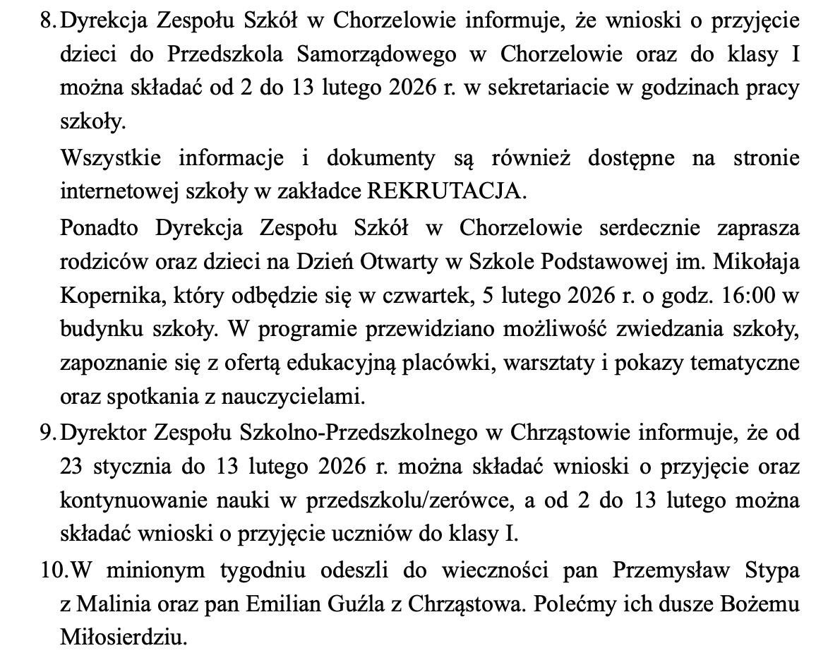 Ogłoszenia, 8 lutego 2026 r.